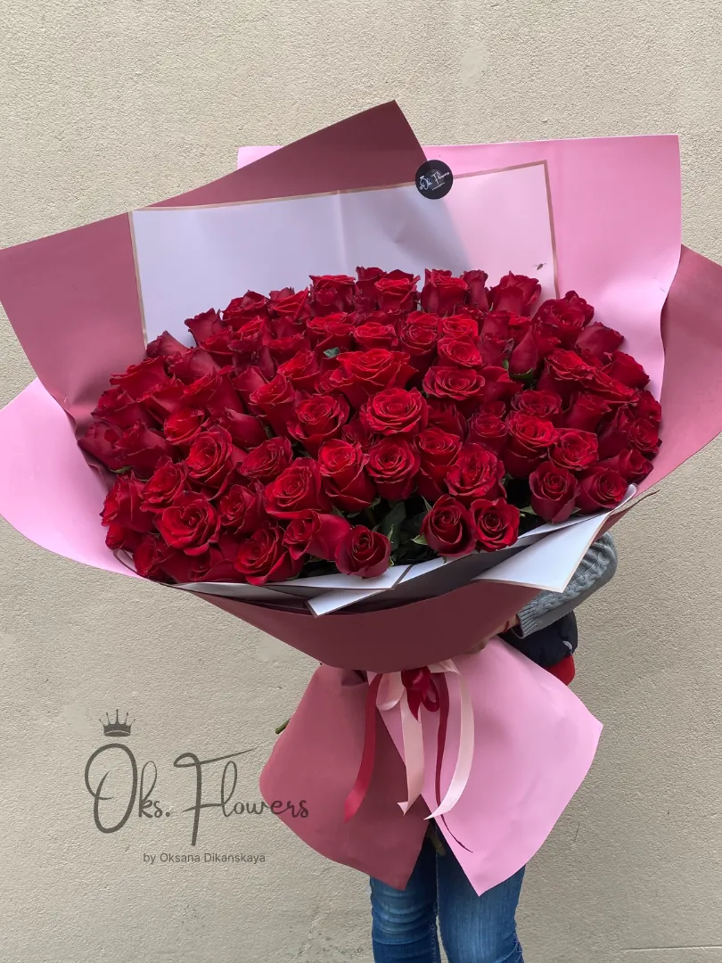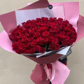 Роскошный букет из 101 красной розы — воплощение страсти, любви и роскоши. Каждый цветок отобран вручную, чтобы создать идеальную форму и насыщенный аромат. Упакован в стильную матовую плёнку с розовой лентой.