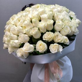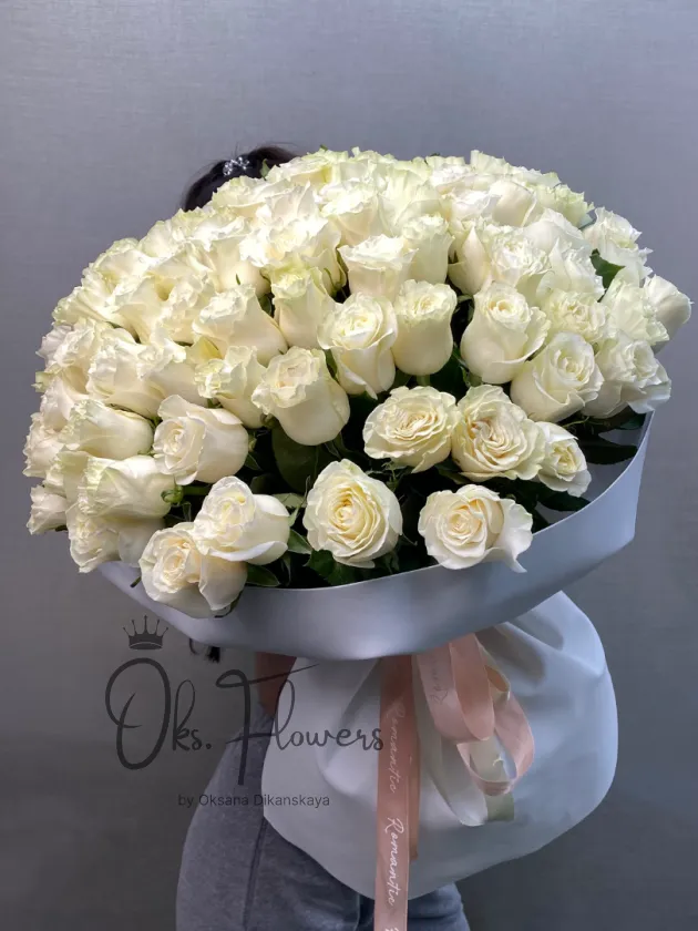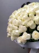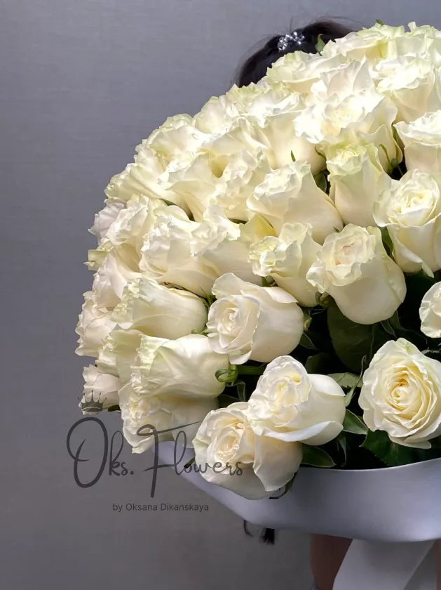 Это огромный, чистый и элегантный букет, где белые розы создают ощущение безупречной красоты и преданности. Идеальна для тех, кто ценит чистоту чувств, силу любви и вечную красоту.