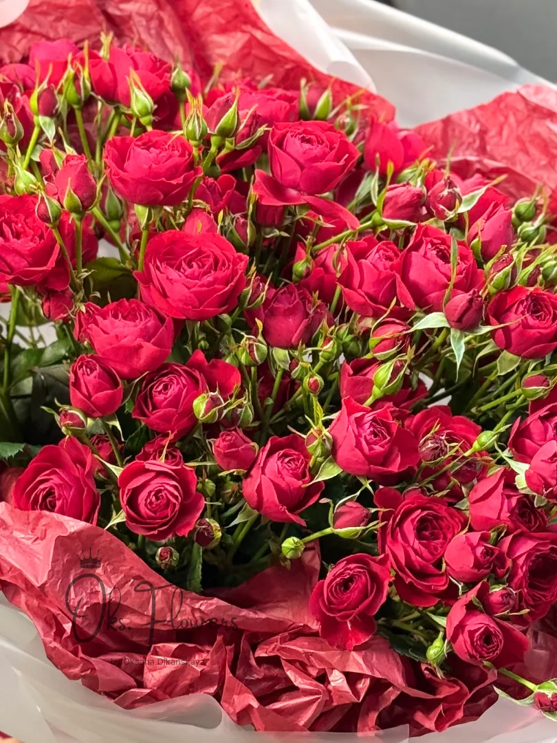 Это мощный, яркий и страстный подарок: сотни насыщенно-красных роз, словно живое пламя, наполняют пространство теплом, любовью и силой. Упакованные в контрастную бумагу с лентой — они идеальны для тех, кто ценит эмоции, глубину чувств и безупречную красоту.