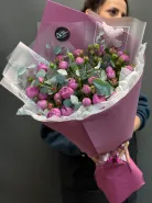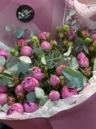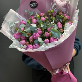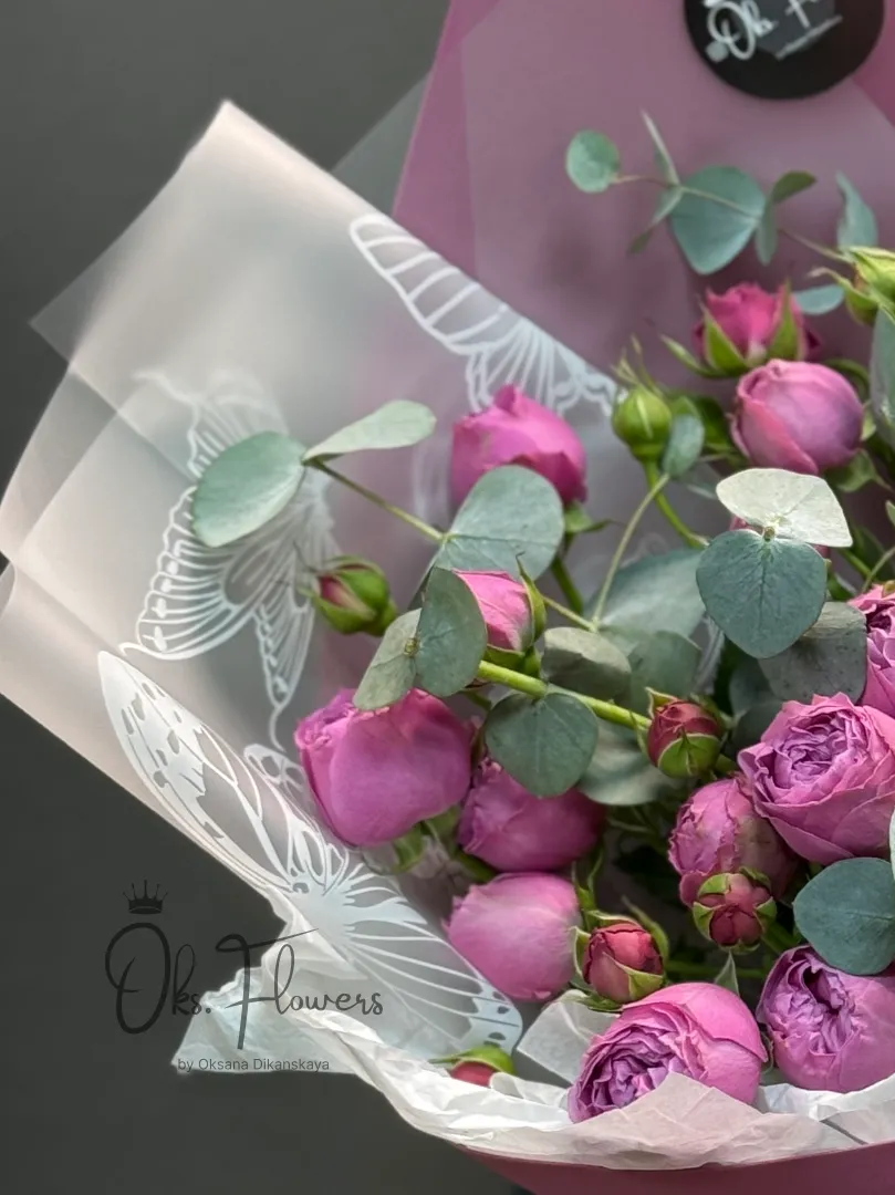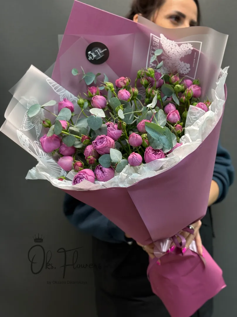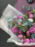 Это нежный, таинственный букет из глубоких фиолетово-розовых кустовых роз, словно шепчущих о чувствах, которые трудно выразить словами. Свежий эвкалипт добавляет лёгкости и контраста, подчеркивая каждую деталь. Упакованный в матовую фиолетовую бумагу с белой подкладкой — он идеален для тех, кто ценит утончённость, загадочность и женственность.