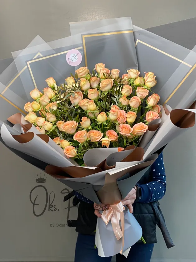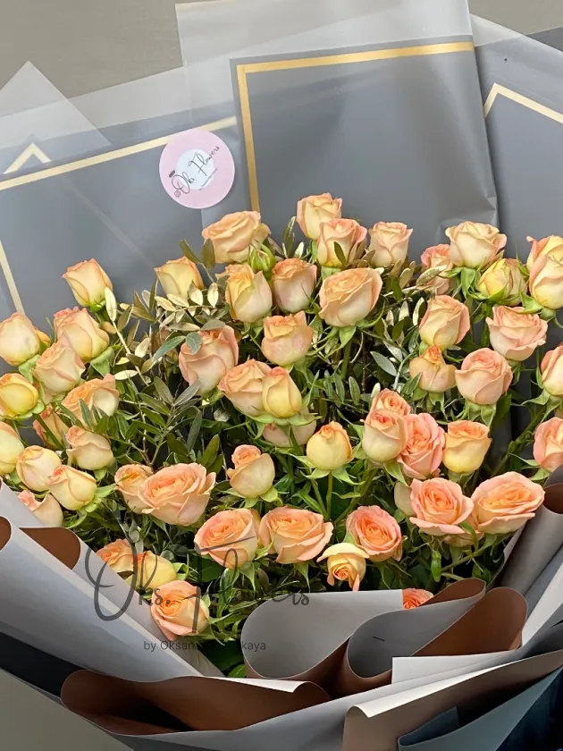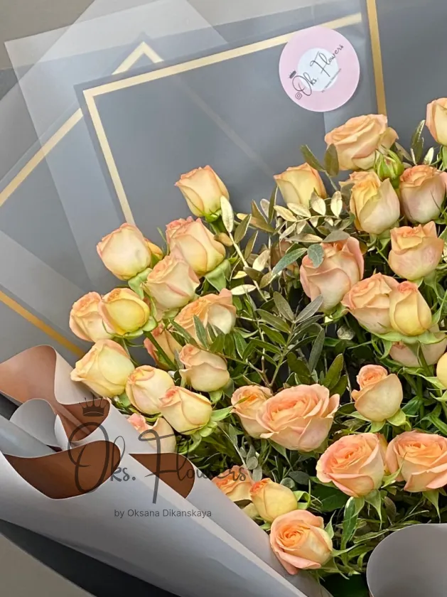 Это мягкий, воздушный букет из персиковых роз — словно первый свет дня, усыпанный цветами. Упакованный в матовую бумагу — идеален для тех, кто ценит нежность, гармонию и природную красоту.