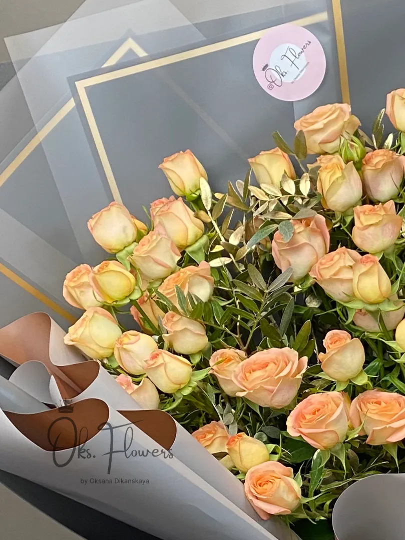 Это мягкий, воздушный букет из персиковых роз — словно первый свет дня, усыпанный цветами. Упакованный в матовую бумагу — идеален для тех, кто ценит нежность, гармонию и природную красоту.