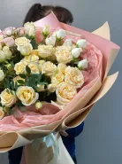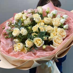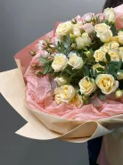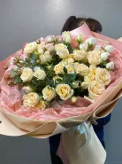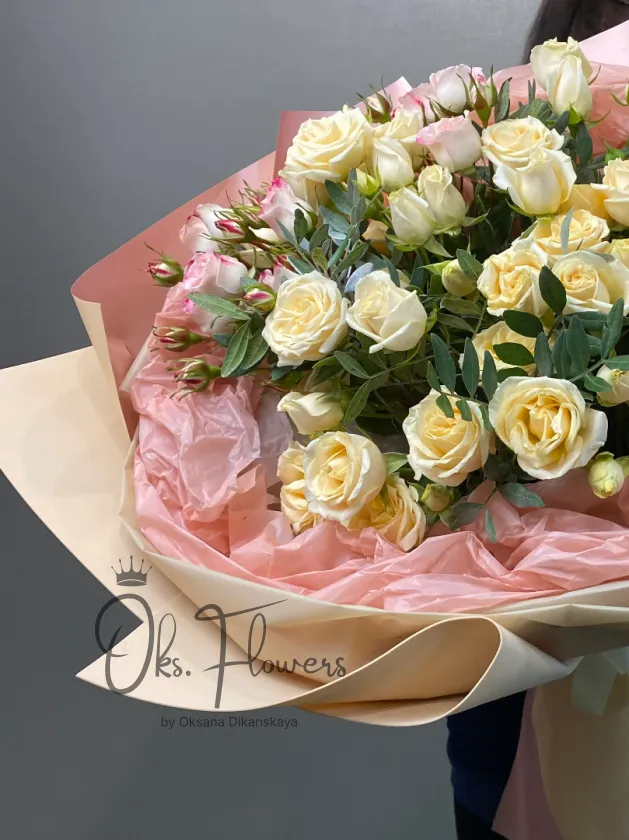 Это пышный, светлый и утончённый букет из кремовых роз с акцентом белых бутонов — словно мечта, ожившая в лепестках. Упакованный в пастельную бумагу — идеален для тех, кто ценит элегантность, чистоту и женственность.