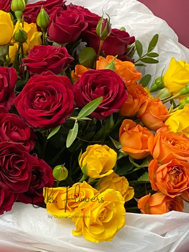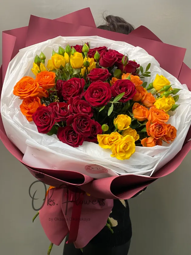 Яркий и роскошный букет из кустовых роз в насыщенных оттенках — красном, оранжевом и жёлтом. Символ страсти, энергии и радости. Такой букет станет идеальным подарком на день рождения, юбилей или в знак признательности близкому человеку.