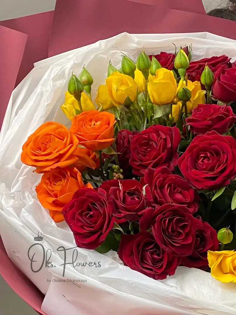 Яркий и роскошный букет из кустовых роз в насыщенных оттенках — красном, оранжевом и жёлтом. Символ страсти, энергии и радости. Такой букет станет идеальным подарком на день рождения, юбилей или в знак признательности близкому человеку.